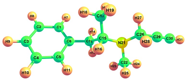 Figure 1: Optimised geometric structure of (2R)-N-methyl-1-Phenyl-N-prop-2-ynylpropan-2-amine.