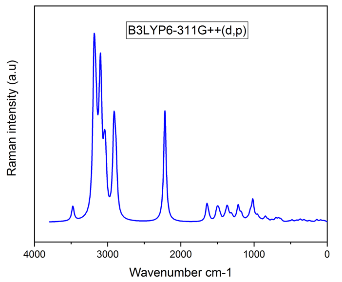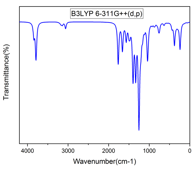 Vibrational analysis of the title compound was carried out in detail through FT-IR and FT-RAMAN studies. For a non-linear compound, the title compound will have n = 3N-6 normal vibrational modes, i.e., n = 87. The contribution of vibrational frequency by a particular set towards the potential energy were represented as potential energy distribution (PED%) and their values are tabulated in table 2 [17]. A factor of 0.961 was multiplies to the unscaled frequency values to get the scaled values as they are more refined and accurate. Types of vibration such as stretching, bending and torsional were given by the vibrational assignment. All vibrational calculations were carried out by GAUSSIAN 09W with basis set, B3LYP/6-311++G (d, p). fig.2 and fig.3 represents the theoretical FT-IR and FT-RAMAN spectra.