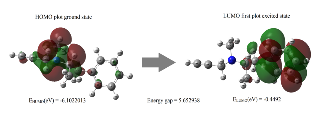 Figure 4: The molecular orbitals and energies for HOMO and LUMO of ethyl (2R)-N-methyl-1-phenyl-N-prop-2-ynylpropan-2-amine