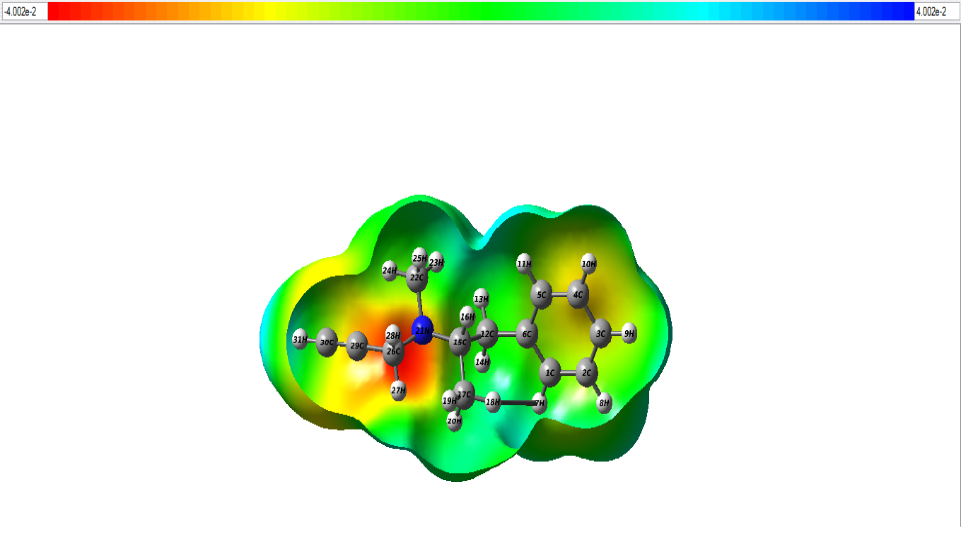 The distribution of charges over a 3-dimensional space creates an electrostatic potential around it. MEP also known as molecular electrostatic potential explains us about how the molecule would react to charges surrounding it. The mapping of MEP was done with DFT methods along with basis set B3LYP/6-311++G (d, p) [27]. There are two major sites in a molecule namely electrophilic sites wherein the atoms in this region have tendency to attract electrons and nucleophilic sites wherein the atoms in this region are ready to share electrons. MEP diagram is shown in Fig.6. The colour region varies from red to blue where red signifies electrophilic site and blue signifies nucleophilic site. Potential in the current study ranges from – 4.002e-2 eV to 4.002e-2 eV. From the figure, the red region denotes electrophilic region which is due to the presence of N21 atom [28,29]. The blue region at the borders constitutes nucleophilic sites. H atoms occupying this region are nucleophilic in nature. The green site in map indicates neutral sites.