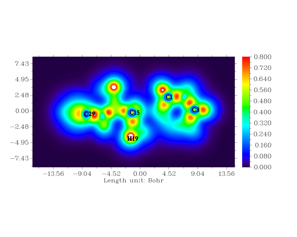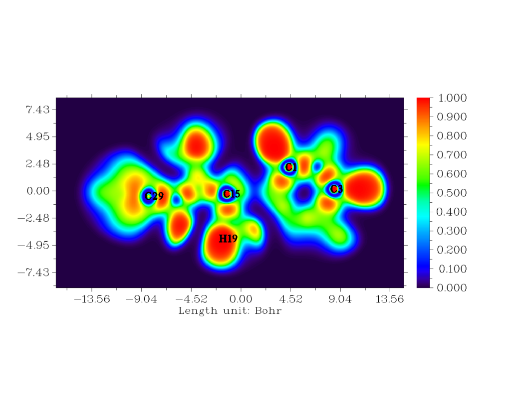 The red orange region depicts strong electronic localisation [33,34]. Localized orbital locator is like that of ELF. The hydrogen and carbon regions have minimum values of LOL. The LOL has colour codes ranging from 0.000 to 0.800 [35]. The white region encircled with red region of H19 atom indicates that there is an excess of electron cloud which exceeds the covalent region.