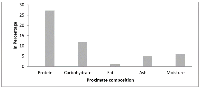 Proximate composition. In this present study the protein, carbohydrate, fat, ash and moisture content of M. meretrix were found to be 27.24 %, 11.95 %, 1.18 %, 4.92 % and 6.13 % respectively. Among the proximate compositions, the protein content was the predominant one (Figure 1).