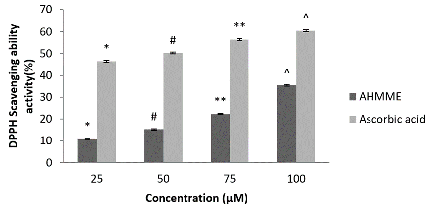 Total antioxidant activity. AHMME showed maximum total antioxidant activity (%) of 72.26±0.30 at 100µgml-1 and minimum activity was observed in 25 µg/ml-1. Similarly the standard ascorbic acid showed maximum 71.7±0.81 at 100 μM and minimum activity at 25 μM/ml-1 was observed. The study of AHMME delivered significant result compared to standard ascorbic acid and the total antioxidant activity was found directly proportional manner (Figure 7).