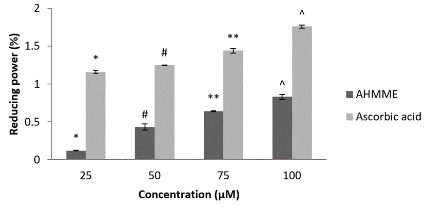 Reducing power assay. Reducing power of the AHMME was quantified by the method described earlier (Yen and Chen, 1995). The reaction mixture containing different concentrations of AHMME and standard ascorbic acid were taken in the concentration of 25, 50, 75 and 100 µM respectively. In this concentration, phosphate saline buffer (0.2 M, pH 6.6) was incubated at 50 oC for 20 min with potassium ferric cyanide (1%, w/v) at 50 oC. The reaction was terminated by adding TCA solution (10%, w/v) and the absorbance was measured at 700 nm. The increased absorbance of the reaction mixture indicated increased reducing power.