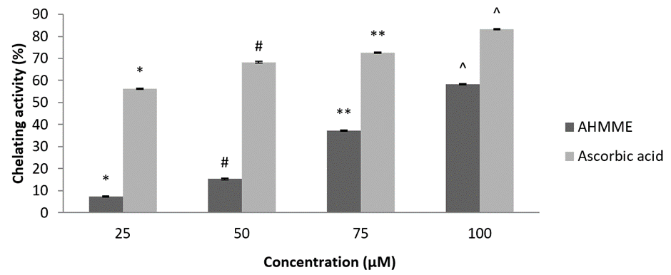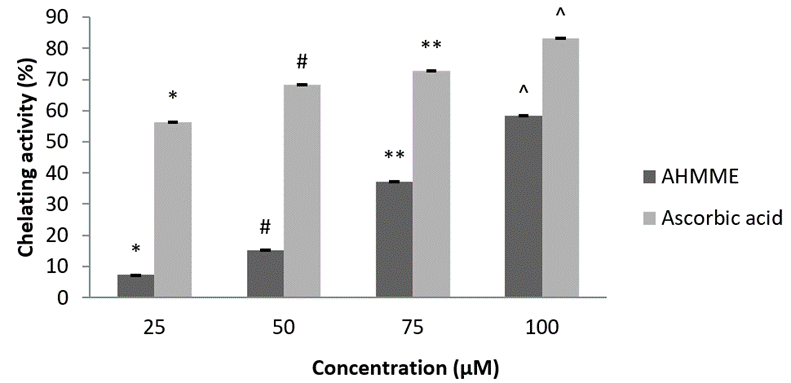 Ferrous-ion-chelating assay. The ferrous ion chelating potential of AHMME extract was investigated according to the method (Decker and Welch, 1990). The Fe2+ chelating ability of extract was monitored by measuring ferrozine complex at 562 nm. The reaction mixture containing AHMME and standard EDTA were taken in the concentration of 25, 50, 75 and 100µM respectively. In this concentration, FeCl2 (2 mM) and ferrozine (5 nM) was adjusted to a total volume of 0.8 ml with water, shaken well and incubated for 10 min. The absorbance of the mixture was measured at 562 nm against blank. EDTA was used as positive control and the ability of protein to chelate ferrous ion was calculated by following formula,