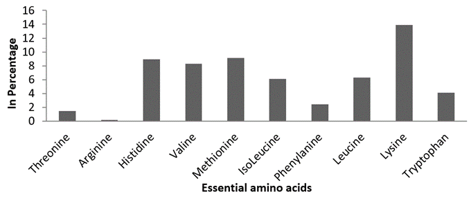 Essential amino acids. In this study, a total number of 10 essential amino acids were recorded. Among the amino acids composition, Lysine 13.87%, Histidine 8.96%, and Methionine 9.13% were noted at higher concentrations and the remaining amino acids were observed in trace quantities (Figure 2).