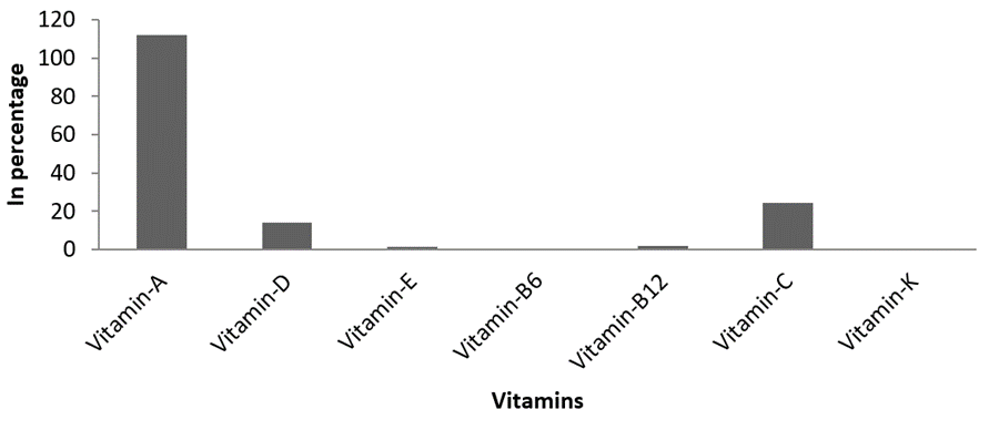 Vitamin composition. The Vitamin compositions of the present investigation were represented in Figure 5. Totally seven vitamins were recorded, Among which Vitamin A (108.4 IU) was observed at highest level followed by Vitamin C and D, with 23.98 mg/g, 13.82 IU,2.08 µg/g. Vitamin B12, E, K and B6 were recorded in meager quantities of1.98, 1.14, 0.59 and 0.31 respectively.