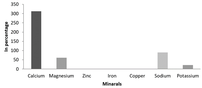 Mineral composition. Themineral composition analysis of study species showed higher and moderates levels of various minerals. The higher concentration of Calcium 314.23 mg/g, Sodium 88.32mg/g, and Magnesium 60.21 mg/g were recorded, while the Potassium, Zinc, Iron and Coper were recorded in inadequate quantities (Figure 6).