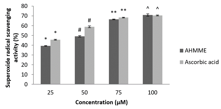 Superoxide radical scavenging activity. AHMME showed significant superoxide anion radical scavenging activity when compared with the standard ascorbic acid (70.5±0.45). The maximum (71±1.13 at 100 µgml-1) scavenging activity of AHMME was recorded and 100 µgml-1 minimum was 39.26±0.25 at 25 µgml-1 concentration (Figure 8).