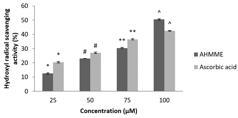 Hydroxyl radical scavenging assay. Hydroxyl radical scavenging assay was calculated by the standard method (Aruoma and Halliwell, 1988). The reaction mixture containing AHMME and standard ascorbic acid were taken in the concentration of 25, 50, 75 and 100 µM respectively. In this concentration was incubated with deoxyribose (3.75 nm), H2O2 (1 mM, pH 7.4) at 37 oC. The reaction was terminated by adding TBA (1%, w/v) and TCA (2%, w/w) and then test tubes were incubated at 100ºC for 20 min. The contents were cooled and absorbance (OD) of the mixture was measured at 535 nm against reagent blank. Absorbance of reaction mixture was directly proportional to the decreasing rate of oxidation of deoxyribose.