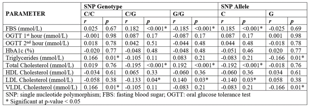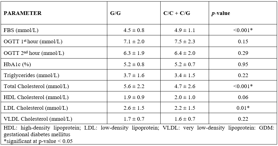 Results: Results of the study suggest that the C/G and G/G genotypes are significantly associated with GDM development. Moreover, the presence of C/G and G/G genotypes are significantly associated with fasting blood sugar, total cholesterol, and low-density lipoprotein cholesterol levels. On the other hand, the C/C genotype is significantly correlated with triglycerides and very low-density lipoprotein levels.