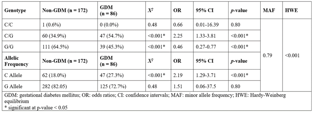 Methods: A cross-sectional design study was utilized, and with ethical approval, 258 pregnant women (86 cases and 172 controls) from various clinics and hospitals in Metro Manila, Philippines were recruited. Whole blood and serum samples were taken from each participant for analysis. Laboratory tests such as oral glucose tolerance test, glycated hemoglobin, and lipid profile were performed. Genomic DNA was extracted from the buffy coat and was subjected to analysis using TaqMan assay to identify the genetic polymorphism.