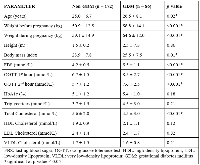 Table 1: Mann-Whitney U-test analysis of the physical and biochemical characteristics of non-GDM and GDM participants.