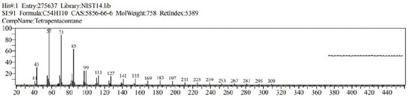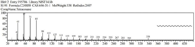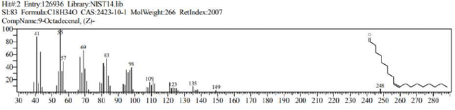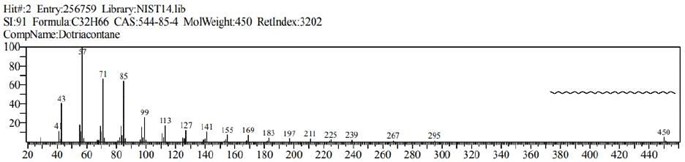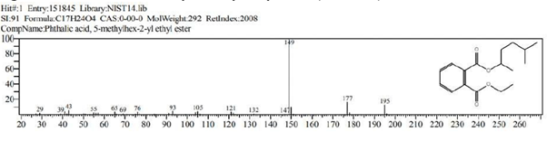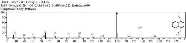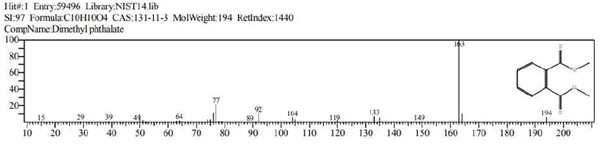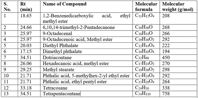 The GCMS analysis identified thirteen compounds from the extract. Those are: 1,2-Benzenedicarboxylic acid, ethyl methyl ester (Figure 2. C11H12O4), 6,10,14-Trimethyl-2-Pentadecanone, (Figure 3. C18H36O), 9-Octadecenal (Figure 4. C18H34O), 9-Octadecenoic acid, methyl ester (Figure 5. C19H36O2), Diethyl Phthalate (Figure 6. C12H14O4), Dimethyl Phthalate (Figure 7. C10H10O4), Dotriacontane (Figure 8. C32H66), Hexadecanoic acid, methyl ester (Figure 9. C17H34O2), Methyl Stearate (Figure 10. C19H38O2), Phthalic acid, 5-methylhex-2-yl ethyl ester Figure 11. C17H24O4), Phthalic acid, ethyl pentyl ester (Figure 12. C15H20O4), Tetracosane (C24H50) and Tetrapentacontane (Figure 13. C54H110).