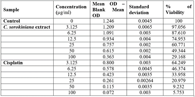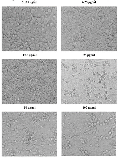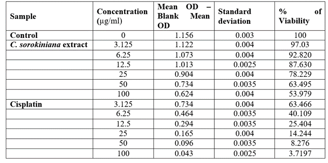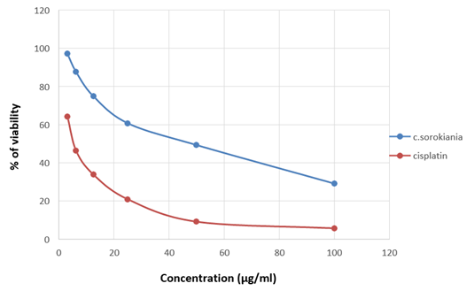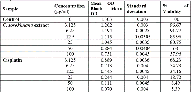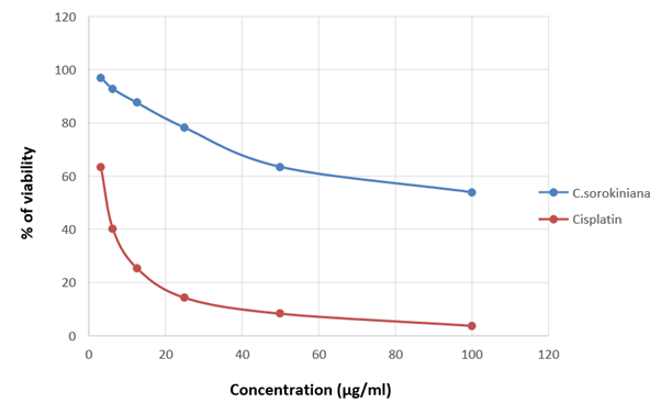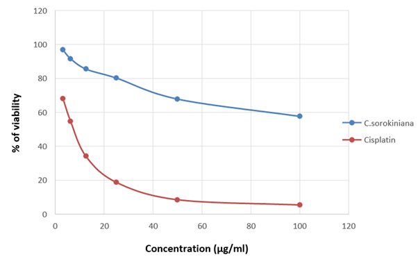 The anti-cancer activity of Chlorella sorokiniana was assessed using MTT assay, serial two-fold dilutions (3.125-100 µg) of the sample was prepared.