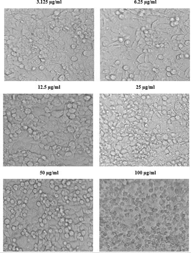 The monolayer cell culture was trypsinized and the culture was diluted to 1.0 x 105 cells/ml using medium containing 10% FBS. 100μl of the diluted cell suspension was added to each well of the 96 well microtiter plate such that there are 1 x 104 cells/well. After 24 hours, when a partial monolayer was formed, the supernatant was removed, washed with medium and 100 μl of 3.125 µg/ml, 6.25 µg/ml, 12.5 µg/ml, 25 µg/ml, 50 µg/ml, 100 µg/ml concentrations of test samples were added on to that. The plate was then incubated at 37 oC for 24 hours in 5% CO2 atmosphere. The test solutions were discarded from the well and 20 μl of MTT (2 mg/1 ml of MTT in PBS) was added to each well. The plate was incubated for 4 hours at 37 oC in 5% CO2 atmosphere. After the removal of supernatant, 100 μl of DMSO was added and the plate was gently shaken to solubilize the formed formazan. The absorbance was measured using a microplate reader at a wavelength of 570 nm for all the cell lines. The percentage of viability was calculated using the following formula.
