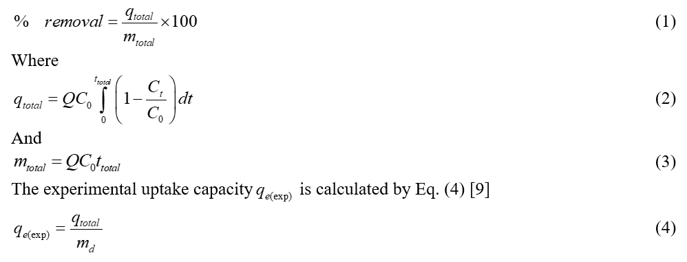 Cu(II) adsorption from aqueous media was done within a fixed bed column at an initial metal concentration ranging from 10-30 mg L-1, bed height ranging from 3-7 cm and flow rate ranging from 10-30 ml min-1 using three glass columns 33 cm long and with an inner diameter of 1.5 cm. A stainless-steel sieve plate was provided as base support, and a little glass wool was placed over it. The columns were packed with the requisite amount of adsorbent. The influent Cu(II) solution was allowed to pass through the columns using a peristaltic pump (Model 7535-04, Cole-Parmer, USA) in down-flow mode at optimum pH 6.5 [5] and room temperature. The resultant Cu(II) solution was quantified using AAS (AA 240 VARIAN, Australia Varian Spectra AA 55, USA) by the standard procedure [6] at set intervals. The percentage removal efficiency was calculated using Eqs. (1-3) [7,8].