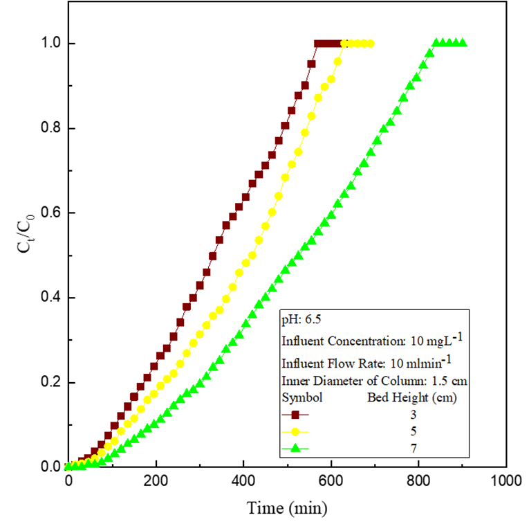 The adsorption experiments were carried out at various bed heights, 3 cm, 5 cm and 7 cm, (Figure 1) with constant metal ion concentration, 10 mg L-1 and constant flow rate, 10 ml min-1. Breakthrough and exhaustion time were raised with bed height, signifying improved Cu(II ) removal due to greater accessibility of adsorptive sites and higher bed residence time at greater bed depth [8].