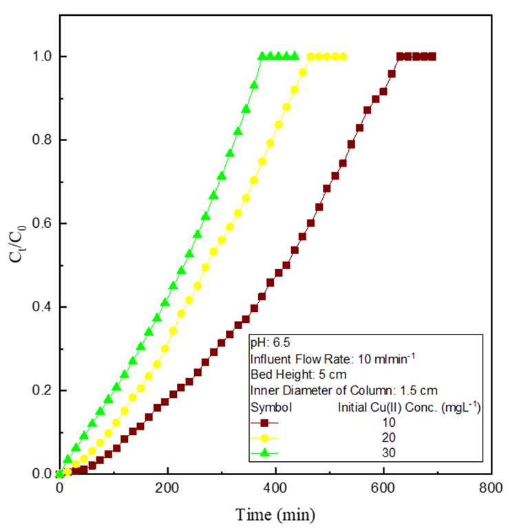 The experimental observations were recorded at various influent dye concentrations (10-30 mg L-1) (Figure 3) at constant bed height (5 cm) and constant flow rate (10 ml min-1). Breakthrough time, as well as exhaustion time, are reduced with Cu(II) concentration, signifying less Cu(II) removal due to a faster rate of diffusional mass transfer and faster saturation rate of binding centres at higher Cu(II) concentration [7,8].