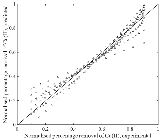 For the equation related to multiple linear regression, all the independent variables as chosen for this study are bed height (Z), column diameter (Dc), flow rate (Q), time (t), influent concentration (Co) and residual concentration (Ct), and the dependent variable was removal percentage of Cu(II), i.e., ![]()