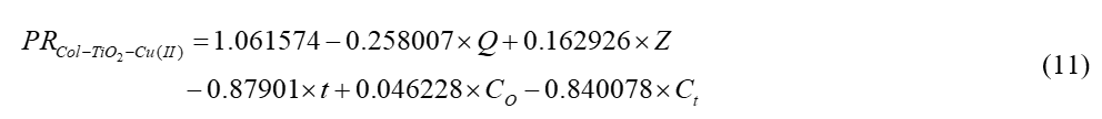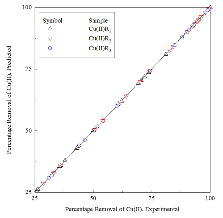 The data from Table 3 yielded the following first-degree polynomial equation for measuring the removal efficiency of Cu(II) by CTNC1-1.