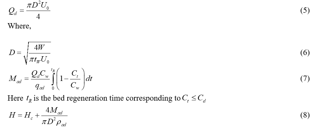 Based on the surface reaction theory, this model assumes that the equilibrium is not attended in a continuous adsorption process, and the adsorption rate is proportional to the adsorption capacity. The rate constant decreased with bed height and influent concentration but increased with flow rate. The adsorption capacity of the bed decreased with bed depth but increased with influent concentration. |