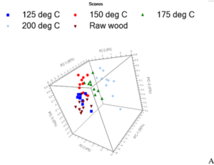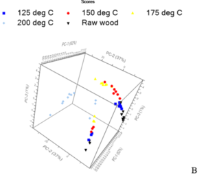 Table 2 presents the confusion matrix for the model from SNV transformed NIR spectra. As presented in the table, 1 out of 7 specimens from 125 oC was undiscernible with that of 150 oC treatment temperature. Treatment temperature 150 oC and 175 oC had 1 out of 7 specimens in common space with each other. Similar to the previous model, the raw and treatment temperature 200 oC were 100% discernible from rest of the treatments.