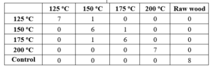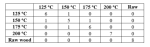 Table 4 presents the results of the classification of unknown specimens using the developed SVMC models. Two out of the 15 specimens were classified wrong using model 1 resulting in success rate of 86.6 %. Contrary to the previous results, one of the specimen from 125 oC was classified as raw wood.