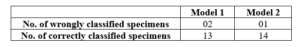 As presented in table, the model 2 resulted in 3 wrong classified specimens. Out of total, 1 number of specimen of 150 oC was classified as 125 oC. Rest of the two specimens wrongly classified were from 150 oC and 175 oC.