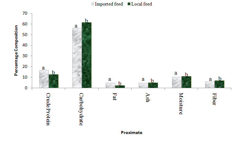 The proximate composition of the feeds showed that percentage crude protein (16.85 %), and fat (5.08 %) contents were higher in the imported commercial feed while carbohydrate ((61.58 %), ash (5.03 %), moisture (11.05 %) and fiber (7.12 %) were higher in the locally formulated feed (Figure 1). Difference in the proximate composition of the feeds was significant (p < 0.05).