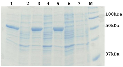 Figure 2: 12% SDS-PAGE analysis of LsrA over production. Lane 1, 3 and 5: A cell free extract of E. coli BL21 (DE3) containing pET30b(+)-lsrA induced sample, Lane 2 and 4: A cell free extract of E. coli BL21(DE3) containing pET30b(+)-lsrA uninduced sample, Lane 6 and 7: A cell free extract of E. coli BL21(DE3) containing pET30b (+) induced and uninduced sample, Lane M : Protein Molecular Weight Marker.