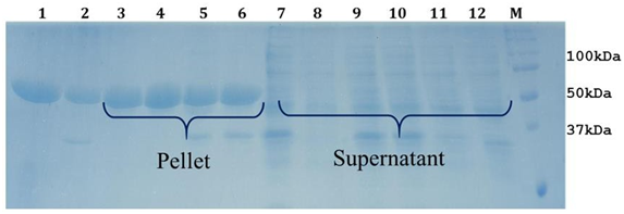 Figure 3: 12% SDS-PAGE analysis of LsrA solubilization using Urea.Lane1: LsrA whole cell pellet. Lane 2: whole cell lysate. Lane 3 and 7: LsrA solubilization of supernatant and pellet with Tris-Cl (pH 12.0), Lane 4 & 8: LsrA solubilization of supernatant and pellet with Tris-Cl (pH 10.0), Lane 5 & 9: LsrA solubilization of supernatant and pellet using 500 mM NaCl, Lane 11: LsrA solubilization of supernatant using 70µg/ml lysozyme, Lane M: Protein Molecular Weight Marker.