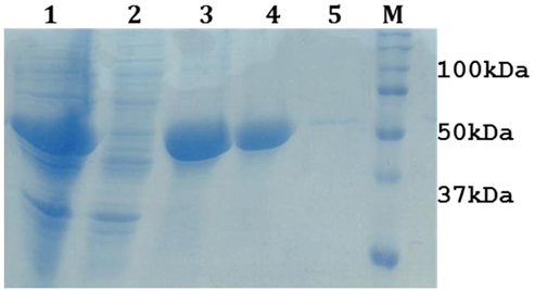Figure 5: 12% SDS-PAGE showing the optimization of LsrA solubilization. Lane1 & 2 represents LsrA whole cell pellet & lysate (after sonication), Lane 3 & 4: LsrA-IBs, Lane 4: LsrA solubilization in supernatant (dissolved in 8M Urea with 10mM aspartic acid) Lane 5: LsrA solubilization in pellet, Lane M: Protein Molecular weight marker .