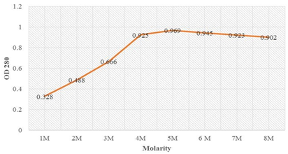 Figure 6: Optimization denaturation of LsrA using different urea concentration showing sharp rise in the absorption from 4M to 6M urea concentration and further on stabilized till 8M urea denaturation.