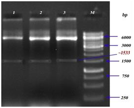 Supplementary Figure 2: Restriction digestion analysis of LsrA. Lanes 1, 2&3: Recombinant construct of lsrA (pET30b(+)-lsrA), Lane M:Marker.
