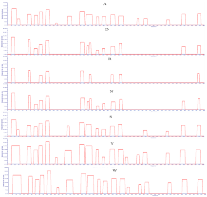 The prediction of APRs is based on the primary sequence of a protein [15]; accordingly, we carried out the primary sequence investigation of S. typhi LsrA, 511 amino acid residues of LsrA were analyzed using ProGene1.0, which shows the molecular weight and isoelectric point as 55.8 kDa and 5.9 respectively. The results of AGGRESCAN 13 server have revealed the presence of 22 APRs which are shown in table 2.