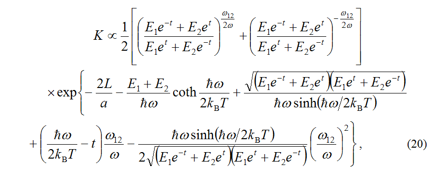 The results of quantum-classical mechanics for the optical spectra of polymethine dyes, discussed above, and their J-aggregates [6-8,16] refer, in particular, to cases of sufficiently high self-organization of quantum-classical transitions, which correspond, generally speaking, to weak dozy chaos (γ ≤ E or γ << E). Cases of low self-organization of quantum-classical transitions, corresponding to strong dozy chaos (γ ≥ E), can be interpreted theoretically on the basis of some simplified version of quantum-classical mechanics. The theoretical construction of this simplified version is based on the fact that under strong dozy chaos, the rates of quantum-classical transitions weakly depend on the details of the chaotic dynamics of the transient state [6,10]. These rates depend mainly on the quantum structure of the initial and final states. In other words, the case of strong dozy chaos corresponds to a slight deviation of quantum-classical mechanics from the standard theory based on the Born-Oppenheimer adiabatic approximation and the Franck-Condon principle.In this case, one can avoid considering the dependence of the complete Green’s function of the system on the finite imaginary addition iγ, and the Green’s function of elementary electron-charge transfers in condensed media can be approximated by the Gamow exponent depending on the transient energy ħω1 of the phonon environment (see [6] and references therein).Physically, this circumstance allows us to speak about the nature of the transient state not in terms of dozy chaos, but in terms of a large number of tunnel and over-barrier transitions promoting the “quantum” transition of an elementary charged particle. This theory [18] was developed long before the creation of quantum-classical mechanics, and now it can be considered as its simplified version.On the basis of this simplified version of quantum-classical mechanics, explanations were given for the Brӧnsted laws in proton-transfer reactions [19-21] (see Section 5) and the temperature-dependent electron transfers in Langmuir-Blodgett films (see Refs 20,46 in [6]). From the general result for the rate constant in the simplified version of quantum-classical mechanics [18], in the framework of the Einstein model of nuclear vibrations (ωk = constant = ω) the simple expression for the rate constant K has been obtained [18]:
