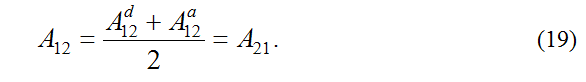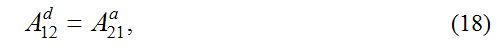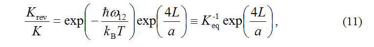 Until now, both in the case of the complete theory for optical processes (Sections 1–3) and in the case of its simplified version for nonradiative processes (Sections 4,5), we have considered the case of the same electron-phonon interaction when a light charged particle, in particular an electron, is localized on the donor or on the acceptor. In other words, it was assumed that the reorganization energy E=E1=E2. For example, “quantum” transitions and the corresponding shapes of optical bands in polymethine dyes are well described by the case of the same value of the electron-phonon interaction on the donor and on the acceptor, because charge alternation occurs in the polymethine chain upon optical excitation [5,10,12]. In this section, we will briefly consider the case of different electron-phonon interactions when an electron is localized on a donor 1 or acceptor 2. This corresponds to different in magnitude the reorganization energy E1≠E2. For example, in the case of nonradiative processes, the change in sign in the heat energy ħω12 (Equations (9) and (10)) and in the donor-acceptor distance L=|L=L12| is associated with the permutation of indices 1 and 2 in the reverse order. The assumption E1 ≠ E2 leads to asymmetry with respect to the permutation of indices 1 and 2 in the expression for the rate constant of transitions and the loss of connection between forward and reverse processes, expressed in Equation (11). To restore this connection, it is necessary to symmetrize the expression for the amplitude and rate constant of electron transfers with respect to different values of the electron-phonon interaction at the donor and at the acceptor, which leads to the case of reorganization energies E1 ≠ E2. The symmetrization method proposed in [22] consists in the fact that, in addition to the transition amplitude [6,10,12]