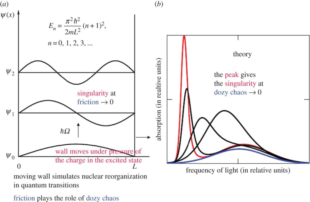 Figure 1: Singularity in the rate of molecular quantum transitions: a potential box with a movable wall (a) and the optical absorption band shape dependent on the dozy chaos available to a given quantum transition (b); the band shape with the strongly pronounced peak (J-band) corresponds to the least dozy chaos [9]. The wall is fastened to the abscissa axis by a freely movable hinge and can move with a certain friction or without friction against the axis. Such a wall simulates the environmental nuclear reorganization in the molecular “quantum” transitions, where dozy chaos plays the role of friction. In the theory [6], this results in the dozy-chaos dependent optical absorption band being displaced to the red spectral region and narrowed (b). The position, the intensity and the width of the optical absorption band are determined by the ratio between the dozy-chaos energy ϒ and the reorganization energy