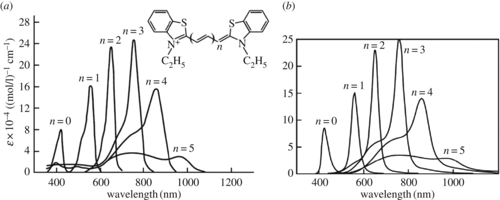 The Egorov resonance explains the fundamental experimental data on the resonant nature of the change in the shape of the optical absorption band and its intensity in the Brooker series [13] of a polymethine dye, in which the length of the polymethine chain is varied (Figure 2).